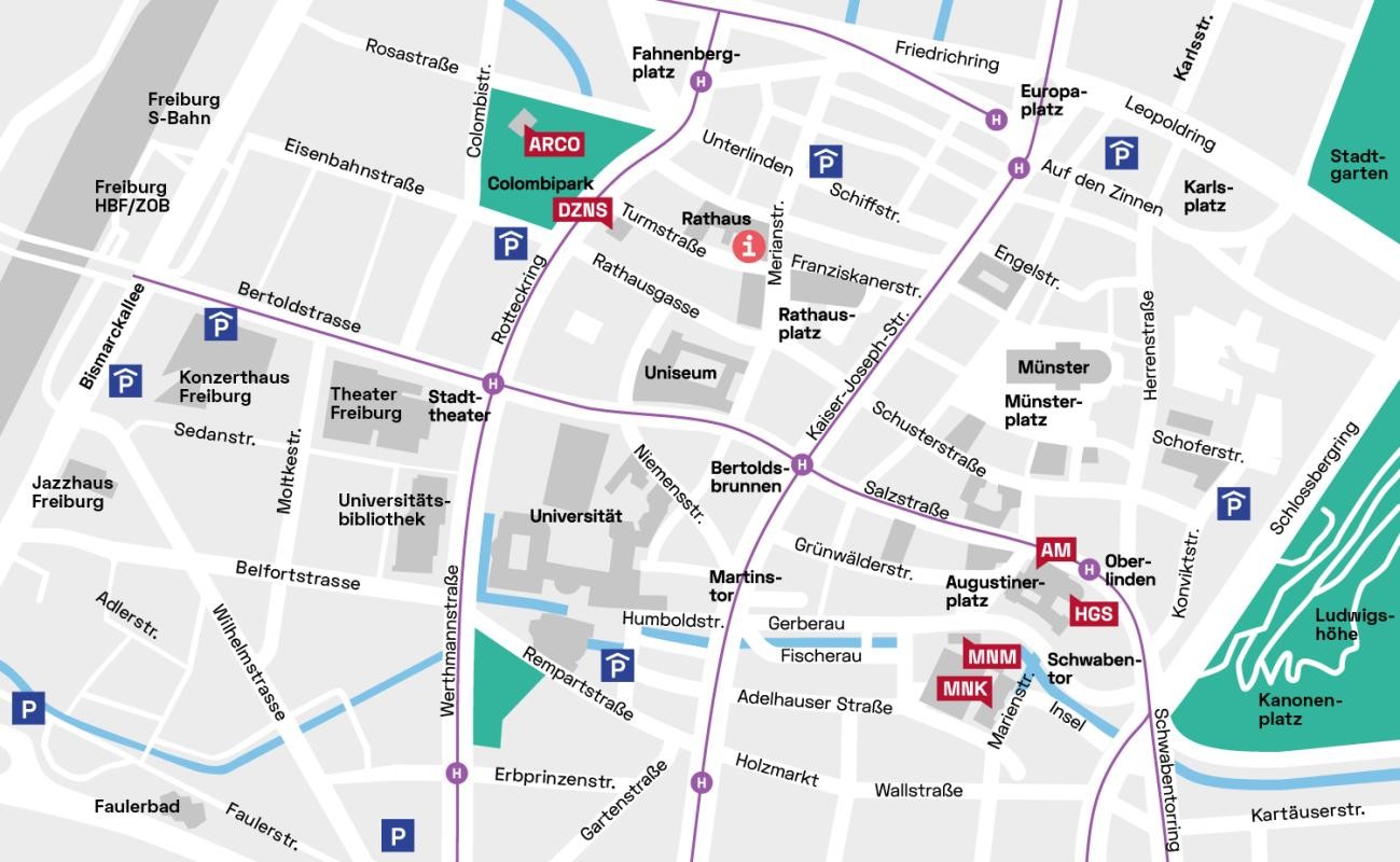 The best way to reach the Archäologisches Museum Colombischlössle and the Dokumentationszentrum Nationalsozialismus is from the car park "Bahnhofsgarage" or "Rotteckgarage".