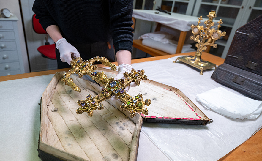 La conservation des œuvres d'art et des biens culturels est la mission centrale d'un musée, à laquelle sont subordonnés les autres domaines d'activité, à savoir la collection, la recherche, l’exposition et la communication. Les Städtische Museen Freiburg se sont engagés à conserver intact le savoir sous forme d'objets relevant de l'histoire de l'art et de la culture ainsi que de l'archéologie, de l'histoire naturelle et de l'ethnologie pour le transmettre aux générations futures et le rendre accessible au grand public. La conservation préventive joue ici un rôle décisif : au lieu de se concentrer sur la restauration des dommages causés par des influences extérieures négatives, il faudrait dans la mesure du possible faire en sorte qu'ils ne se produisent pas. Les objets sont protégés par des conditions environnementales contrôlées, ce qui permet de minimiser les facteurs de détérioration. Il s'agit de protéger l'objet exposé dans toutes les zones où il est exposé ou même entreposé au cours de son existence au musée. Les restaurateurs issus des six domaines spécialisés (peinture, papier, textile, artisanat d'art, ethnologie et archéologie), ainsi qu'une taxidermiste pour les objets d'histoire naturelle, travaillent en étroite collaboration avec les organisateurs d'expositions des différents établissements.